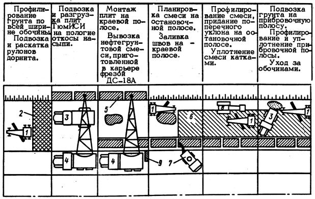 Эти показатели следует уточнять в зависимости от особенностей конструктивных решений укрепления обо чин и откосов, принятой технологии и условий работы материала в дорожной конструкции. Дорнит и другие СНМ, не удовлетворяющие требованиям к устойчивости при воздействии агрессивной среды, допускается укладывать в конструкцию при условии, что будут приняты специальные меры, исключающие данный вид воздействий, или будет проведена дополнительная обработка материала с целью повысить его устойчивость и срок службы. 3.7. Транспортируют дорнит и хранят в условиях, исключающих попадание на него воды, пыли, воздействие солнечных лучей, в соответствии с правилами, приведенными в ТУ 21-29-81-81. СНМ поставляют в рулонах. Допускается поставка до 10 % рулонов, состоящих из двух полотен, при длине каждого из них не менее 25 м. В строительной организации партии дорнита должны пройти приемочный контроль в соответствии с правилами, включенными в технические условия. Особое внимание следует обращать на качество полотен, в том числе на отсутствие дыр, пропусков при иглопробивке, а также на прочность, деформативность, массу 1 м2 материала. Технология производства работ по укреплению обочин3.8. Технология устройства укрепления обочин определяется принятым конструктивным решением (жесткий, нежесткий или комбинированный тип укрепления), порядком ввода дороги в эксплуатацию - в одну или две стадии, а также наличием оборудования. 3.9. При выборе оптимального технологического решения необходимо учитывать, что плотность грунта земляного полотна на обочине недостаточна, его доуплотнение затруднено, фронт работ узкий, объем работ небольшой. В таких условиях эффективно использовать машины с колесным движителем и съемными выносными рабочими органами. 3.10. Цементо- или нефтегрунт для укрепления обочин в зависимости от наличия оборудования приготавливают: в карьерах с использованием стационарных или передвижных смесительных установок; смешением на дороге с использованием дорожных фрез и автогрейдеров; дорожными фрезами методом, предложенным ТюмИСИ, который заключается в следующем: в неблагоприятный период года, когда укрепленный грунт невозможно приготовить непосредственно смешением на дороге, смесь готовят в карьере дорожной фрезой и укладывают в штабели, затем при нормальных погодных условиях ее укладывают на обочину. Нефтегрунт (цементогрунт) для укрепления обочин приготавливают в карьере дорожной фрезой ДС-18А. В дальнейшем для укладки смеси цементогрунта с добавкой нефти или нефтегрунта с добавкой цемента на обочинах можно использовать самоходную машину на колесном ходу ДС-76 (производительность до 120 м/ч, ширина укладываемой полосы 0,5; 0,75 и 1 м, толщина слоя не более 22 см, вместимость бункера 5 т смеси). 3.11. При строительстве дорог в одну стадию обочины укрепляют комбинированно: краевую полосу - плитами, остановочную полосу - ПГС, нефтегрунтом с добавкой цемента или цементогрунтом с добавкой нефти. Технология укрепления обочин конструкцией нежесткого типа предусматривает следующие операции: профилирование грунта на обочине автогрейдером; подвозку и раскатку на обочине рулонов дорнита; подвозку и разгрузку плит на пологие откосы насыпи; монтаж плит на краевой полосе автокраном; вывозку и разгрузку нефтегрунта, приготовленного в карьере фрезой 