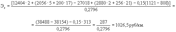где И1, И2 - годовые издержки при эксплуатации 1км укрепленной обочины по базовому и предлагаемому вариантам, т.е. затраты на средний, текущий и капитальный ремонты за счет увеличения срока службы обочины; К1, К2 - сопутствующие удельные капитальные вложения в машины и оборудование, которые необходимы для нормальной эксплуатации базового и предлагаемого укрепления обочин (условно принимаем их равными приведенным в п. 10 табл. 5 ) .приходящиеся на I км обочины. 6.4. Для определения годовых издержек при эксплуатации 1 км укрепленной обочины срок службы сборного бетонного покрытия (плиты ПАГ-14) на автомобильных дорогах нефтяных промыслов (при соблюдении предусмотренной проектом технологии его устройства и требуемых условий эксплуатации) принимается равным 24 годам, межремонтные сроки службы асфальтобетонного покрытия - 18 лет для капитального ремонта, 6 лет - для среднего ремонта; для гравийного покрытия эти сроки соответственно 9 лет и 3 года. Исходя из таких условий, определяется количество ремонтов за 24 года для базового варианта: капитальных ремонтов 2, средних 5 и текущих 17; для предлагаемого варианта требуется: капитальных 1, средних 2, текущих 21. Стоимость капитального ремонта для предлагаемого варианта принимается равной стоимости устройства нового укрепления З2 + Зс2 = 26306,6 + 711,4 = 27018 руб. на 1км (прил. 5 и табл. 5 ), для базового варианта З1 + Зс1 =11865,6 + 537,9 ≈ 12404 руб. Стоимость среднего и текущего ремонтов для базового варианта соответственно 2056 и 200 руб.; для предлагаемого варианта стоимость среднего ремонта - 2880 руб., текущего - 256 руб. (согласно ООН 39-79). Тогда экономия при эксплуатации получается: