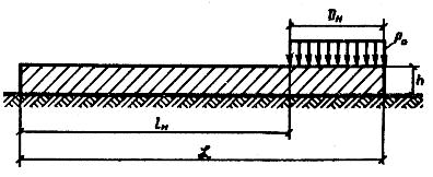 где qрас - расчетное давление на основание от вертикальной нагрузки; qдоп - допустимое давление на основание. Рис.1. Расчетная схема балки на упругом основании, загруженной на конце, для расчета по сдвигоустойчивости в грунте основания Рис.2. Расчетная схема балки на упругом основании, загруженной симметрично в середине, для расчета на растяжение при изгибе Значение qрас (МПа) определяется, по формуле