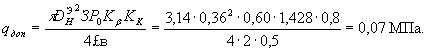 Тогда nj = 0,91; nq = 1,54; nс = 1,11. qдоп =1,18 · (0,98 · 0,91 · 0,5 · 18000+4,93 · 1,54 · 0,18 · 18000+7,4 · 3800 · 1,11)= =75328Н/м2 =0,075МПа. Первое условие выполняется, производят расчет по второму условию. Толщину