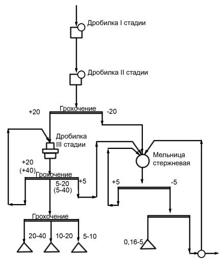 Рис.1. Технологическая схема переработки каменных материалов с получением щебня и дробленого песка
