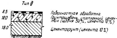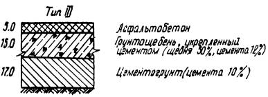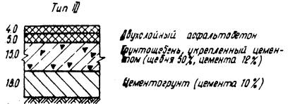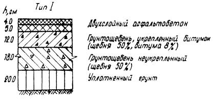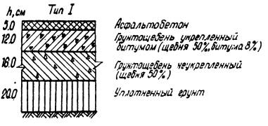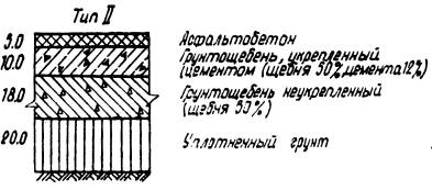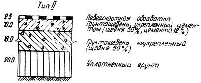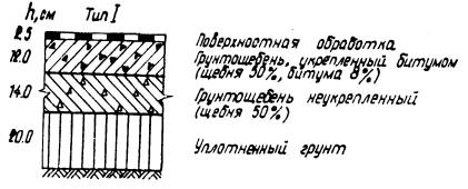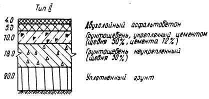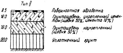 Рис. 4. Конструкции дорожных одежд с грунтощебеночными слоями при Еэкв = 1000 кг/см2. ТЕХНОЛОГИЧЕСКИЕ ПРАВИЛАПО СТРОИТЕЛЬСТВУ ГРУНТОЩЕБЕНОЧНЫХ СЛОЕВ ДОРОЖНЫХ ОДЕЖД23. Прочный и водоустойчивый слой грунтощебня получают путем технологических операций, главными из которых являются перемешивание и уплотнение. Только после надлежащего перемешивания составляющих и уплотнения грунтощебеночной смеси до максимальной плотности можно получить грунтощебеночный слой требуемой прочности. С этой точки зрения грунтощебень следует рассматривать как продукт технологии. Перемешивание и уплотнение составляющих грунтощебня до максимальной плотности производится при оптимальной влажности. Оптимальная влажность определяется экспериментальным путем в лаборатории. 24. Перемешивание составляющих грунтощебня может быть произведено в стационарных смесителях, а также непосредственно на дороге в передвижных смесительных машинах. При этом следует иметь в виду, что качество смешения при различных способах будет различным. Поэтому способ перемешивания выбирается в зависимости от требований, предъявляемых к однородности смеси, а также от сроков строительства и наличия машин и механизмов в дорожно-строительной организации. Прочность грунтощебеночных слоев существенно зависит от прочности нижних слоев и грунтового основания. Поэтому подготовка грунтового основания и устройство нижних слоев покрытия должно производиться очень тщательно. 25. Для устройства слоя грунтощебня может быть использован грунт полотна дороги или грунт резерва. Если между окончанием отсыпки земляного полотна и началом работ по устройству грунтощебеночного слоя имеется продолжительный разрыв, то более рациональным способом является использование грунта резерва. 26. Производство работ может осуществляться с устройством корыта, или без устройства корыта, но с устройством присыпных обочин. Лучшим способом при смешении на дороге является устройство бескорытного профиля, который обеспечивает лучшую работу машин и механизмов, а также облегчает движение автотранспорта. Наличие же корыта в дождливые периоды затрудняет сток воды и высушивание грунта. 27. Поскольку прочность и водоустойчивость слоя в значительной степени зависит от равномерности распределения составляющих в массе грунтощебня, технологические операции должны быть направлены на то, чтобы в данных условиях производства достигнуть максимально возможной степени равномерности распределения составляющих грунтощебня. 28. При применении укрепленного грунтощебня обработка вяжущими материалами может быть произведена обычным и раздельным способом. При раздельном способе грунт обрабатывается вяжущим и далее производится смешение укрепленного грунта и щебня. Раздельный способ обработки грунтощебня обеспечивает более равномерное распределение составляющих в массе грунтощебня по сравнению с обычным способом. 29. Правила укрепления грунтов в составе грунтощебня органическими и неорганическими вяжущими ничем не отличаются от существующих правил укрепления грунтов вяжущими. Первой операцией по укреплению грунта является заготовка грунта. Сюда относятся работы по разработке грунта в резерве или карьере, доставка грунта на проезжую часть дороги, измельчение грунта. При необходимости улучшения грану
