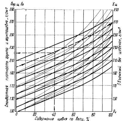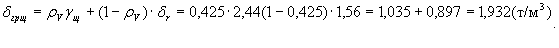 Рассмотрим единицу объема грунтощебня. Пусть щебень с объемным весом отдельных щебенок γщ занимает в единице объема грунтощебня какую-то часть pv. Стандартную плотность грунта (мелкозема) в составе грунтощебня обозначим через δr. Тогда плотность грунтощебня будет равна: