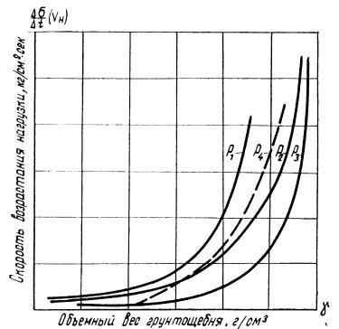 7. Вычисляем объемный вес (γ) грунтощебня на каждой ступени нагрузки. 8. Строим график зависимости скорости возрастания нагрузки от объемного веса грунтощебня данного состава, т. е.