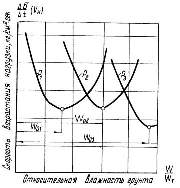 Как видно из таблицы 1, конструкции дорожных одежд с использованием грунтощебня обладают высокой экономической эффективностью, причём, наибольшая эффективность достигается при применении грунтощебня в конструкциях дорожных одежд с эквивалентным модулем упругости Еэкв = 1300 кг/см2. ПРИЛОЖЕНИЕ I.МЕТОДИКА ПРОЕКТИРОВАНИЯ СОСТАВОВ ГРУНТОЩЕБЕНОЧНЫХ СМЕСЕЙДля получения материала с прочной и долговечной структурой, устойчивой при переменном режиме увлажнения и промерзания, чрезвычайно важным является правильное назначение состава грунтощебня. При назначении состава грунтощебня следует исходить из условия достижения наилучшей технологичности и наиболее высокой для данных исходных материалов прочности грунтощебня. Технологичность грунтощебня оценивается по показателям перемешиваемости, уплотняемости, оптимальной влажности и плотности, а прочность грунтощебня- модулю упругости, по пределу долговременного сопротивления при сжатии. Одним из основных вопросов при проектировании составов грунтощебня является также нахождение оптимального количества щебня в смеси. Оптимальное количество щебня зависит от прочности каменного материала, из которого приготовлен щебень. Чем прочнее щебень, тем большее количество его может быть допущено в смеси из условия обламывания углов и ребер щебенок; чем слабее щебень, тем относительно меньшее количество его может применяться в смеси с тем, чтобы не допустить грунтощебень работать по схеме заклинки, при которой слабо прочный щебень интенсивно разрушается. Оптимальное количество щебня по прочности должно находиться во взаимосвязи с оптимальным количеством щебня по уплотняемости. Уплотняемость грунтощебеночных смесей различного состава оценивается величиной средней скорости возрастания нагрузки при постоянной скорости деформирования. Другими словами, устанавливается зависимость приращения нагрузки в единицу времени от объемного веса грунтощебня при условии, что скорость относительной деформации будет поддерживаться постоянной, т. е.