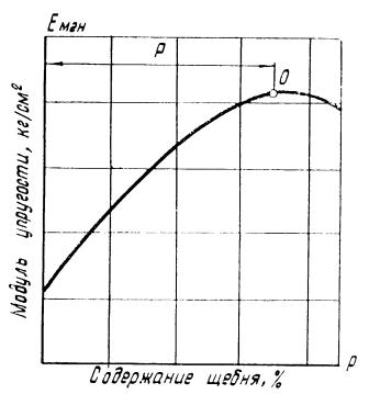 7. Строим график зависимости модуля упругости грунтощебня от содержания щебня (рис.12). Точка максимума на этой кривой определяет оптимальное содержание щебня с точки зрения прочности. Г. Проектирование состава грунтощебняИсходя из вышеизложенного, проектирование состава грунтощебеночных смесей производим в такой последовательности: 1) На основании существующих рекомендаций по укреплению грунтов вяжущими назначаем норму вяжущего для данного типа грунтощебня. 2) Определяем оптимальную влажность и стандартную плотность грунтощебня при различном количестве щебня в смеси (см. п. А). 3) Определяем максимальное количество щебня в грунтощебеночной смеси, исходя из условий достижения лучшей перемешиваемости и уплотняемости (см. п. Б). 4) Определяем оптимальное количество щебня в грунтощебеночной смеси с точки зрения прочности (см. п. В). 5) Производим окончательное назначение количества щебня и других составляющих, исходя из условий достижения наилучшей технологичности и прочности грунтощебня. В производственных условиях необходимо знать количество каждой составляющей грунтощебня для правильной организации работ, т. е. произвести расчет состава грунтощебня. Расчет состава грунтощебня можно произвести, представив единицу объема грунтощебня состоящей из суммы объемов щебеночных, грунтовых частиц, воды, вяжущих веществ, воздуха, то есть