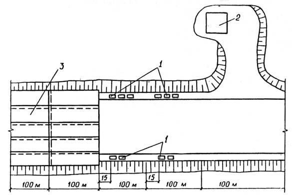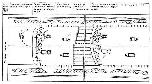 геотекстиля вдоль строящегося участка дороги: Раскатывают и соединяют геотекстильный материал вручную. Уложенную дренирующую прослойку засыпают грунтом по схеме «от себя», распределяя его слоем толщиной 30 см с учетом уплотнения по всей ширине участка. Насыпной слой должен быть тщательно уплотнен. Из условия обязательной засыпки геотекстиля грунтом ,к концу смены раскатка геотекстильного материала опережает отсыпку на 30 м. Соединяют полотна геотекстиля металлическими скобами через 1,5-2,0 м при помощи приспособления для скрепления, разработанного ВПТИтрансстроем. После раскатки дренирующих прослоек производят визуальный осмотр, проверяют сплошность и величину перекрытия полос, исправляют, при необходимости, дефектные места (по результатам осмотра составляют акт на скрытые работы). Проезд машин непосредственно по прослойке не разрешается. 2.3.2.2. Возведение верхней части насыпи из песчаного грунта Технологической картой предусмотрено транспортирование песчаного грунта из карьера треста. Из карьера грунт транспортируют автомобилями-самосвалами КрАЗ-256Б до места производства работ, и выгружают на насыпи через каждые 5 м в продольном направлении, и через каждые 3 м в поперечном направлении, начиная от середины насыпи к краям. Для бесперебойной работы автомобилей-самосвалов ведется непрерывный надзор за состоянием землевозных дорог. Песчаный грунт разравнивают и планируют бульдозерами ДЗ-110А. Грунт разравнивают слоем толщиной 0,4 м за один-два прохода по одному следу по всей площади. Разравнивают грунт бульдозером продольными проходами, начиная от бровки земляного полотна, постепенно приближаясь к оси, с перекрытием предыдущего следа на 0,5-0,8 м. Затем делают грубую планировку поверхности бульдозером с приданием поперечного уклона (20-40%) от оси к бровке земляного полотна. После разравнивания и планировки грунт уплотняют до требуемой плотности катком на пневмошинах ДУ-16В. Работа катка организована по круговой схеме движения (см. рис. 3). Первые два прохода делают на расстоянии не менее 2 м от бровки откоса, каждый последующий проход смещают на 1/3 ширины катка в сторону бровки откоса. После этого продолжают уплотнение продольными проходами, перемещая проходы катка от краев к середине с перекрытием полос на 0,3-0,4 м. Первый и последний проходы производят на малой скорости 2,0-2,5 км/ч, промежуточные на скорости- 8-10 км/ч. Для достижения равномерности уплотнения песчаного грунта давление во всех шинах колес катка должно быть одинаковым. Поверхность должна быть выровнена так, чтобы после уплотнения на ней не было углублений или возвышений более 0,05 м. Ровность поверхности проверяют трехметровой рейкой. 2.3.3. Перечень нормативно-технической литературы При производстве работ по возведению насыпи из переувлажненного связного грунта с дренирующими слоями из геотекстиля необходимо руководствоваться следующей нормативно-технической литературой: СНиП 3.06.03-85 «Автомобильные дороги», М.., Стройиздат, 1986; СНиП III-8-76 «Земляные сооружения», М.., Стройиздат, 1977; «Руководством по сооружению земляного полотна автомобильных дорог», м., Транспорт, 1982; «Методическими рекомендациями по сооружению земляного полотна автомобильных дорог из грунтов повышенной влажности», М., Союздорнии, 1980. 2.4. Указания по организации труда 2.4.1. Работы выполняются на уча