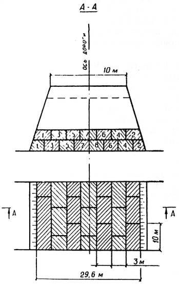 слоями из геотекстиля: Одновременно с расчисткой полосы от снежного покрова поверхности карьера очищают от снега, льда, утепляющих материалов. Сначала удаляют снег и лед, затем рыхлят верхний мерзлый слой и убирают разрыхленный грунт в отвал рыхлителем ДЗ-94С на тракторе Т-330 с бульдозерным оборудованием. Разрыв во времени между удалением верхнего слоя и началом разработки карьера принимают минимальным, с таким расчетом, чтобы не допустить промерзания нижележащего грунта на глубину более 5-10 см. При сильных снегопадах и метелях разработку грунта прекращают, а перед возобновлением работ полностью удаляют снег и лед. После очистки поверхности карьера приступают к разработке суглинистого грунта экскаватором ЭО-5122А, оборудованным прямой лопатой. Грунт разрабатывают продольными проходками боковым забоем, число и размеры которых должны обеспечивать возможность работы экскаватора с наименьшими затратами времени на выполнение рабочего цикла, экскавации. Набор грунта ковшом с «шапкой» должен производиться за одно черпание. Длина проходок должна обеспечивать наименьшее число вводов экскаватора в забой и выводов из него. Ширину проходок принимают такой, чтобы средние углы поворота экскаватора при работе не превышали 70-90°. Контроль за глубиной разработки грунта ведут двумя инвентарными обносками, установленными в направлении, обратном движению экскаватора и в одном створе с направлением его передвижения на расстоянии 30-50 см друг от друга и от экскаватора. Производство работ по разработке грунта повышенной влажности приведено в технологической карте «Возведение насыпи высотой 2,5 м с разработкой переувлажненного грунта в выемке экскаваторами Э-652, ЭО-4121, ЭО-5122 и транспортировкой автомобилями-самосвалами при дальности возки 1, 3, 6 км». Грунт из сосредоточенного карьера транспортируют автомобилями-самосвалами КрАЗ-256Б. Перевозку грунта организуют так, чтобы вынутый из забоя грунт был доставлен в насыпь, разгружен и уплотнен раньше, чем произойдет его смерзание, то есть организация работ и технология их выполнения должны строиться с учетом конкретного времени охлаждения грунта до начала его смерзания. Движение автомобилей-самосвалов организуют по кольцевой схеме, причем в забое автомобили-самосвалы должны двигаться навстречу экскаватору при его проходе. Грунт выгружают в тело насыпи на одной половине ширины слоя по расчету, начиная с ее краев с приближением к оси земляного полотна (рис. 2). При этом движение автомобилей-самосвалов происходит по уплотненному слою грунта на другой половине ширины слоя. По технологии возведения насыпи в каждый автомобиль-самосвал марки КрАЗ-256Б загружают 6 м3. Грунт выгружают через каждые 3 м по ширине и 10 м по длине насыпи, разравнивают слоями толщиной по 0,3 м с последующей послойной планировкой бульдозером и уплотнением катками на пневмошинах сразу же после выгрузки грунта в насыпь. Для обеспечения бесперебойной работы землевозных транспортных средств ведут непрерывный надзор за состоянием землевозных дорог, особенно в местах погрузки и выгрузки грунта, на въездах на насыпи и съездах с них. В местах примыкания временных землевозных путей к выездам на земляное полотно и съездам с него рекомендуется устраивать временные сборные покрытия из инвентарных железобетонных плит. Въезды (съезды