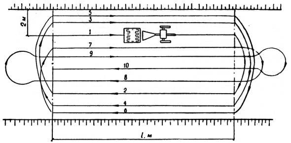Рис. 3. Схема работы прицепного катка на пневматических шинах: 1-10-последовательность проходов; l-длина участка в метрах Приближение рабочих органов катка к бровке насыпи ближе, чем на 0,5 м не допускается. Каждый последующий продольный проход по одному и тому же следу начинают после перекрытия предыдущими проходами всей ширины уплотняемого участка. Первый и последний проходы катков на полосе укладки выполняют на малой скорости 2,0-2,5 км/ч, промежуточные проходы на скорости 8-10 км/ч. Отсыпку последующего слоя можно производить только после разравнивания и уплотнения предыдущего слоя. Аналогичным способом отсыпаются следующие слои по 0,3 м до высоты части насыпи 1,5 м. После отсыпки части насыпи высотой 1,5 м на его поверхности раскатывают геотекстиль, при высоте насыпи 4,5 м устраивают три прослойки. Геотекстильный материал, доставляемый с центральной базы треста или с временного склада, раскладывается вдоль строящегося участка дороги по обе стороны с учетом длины материала в рулоне и перекрываемой ширины дороги. Шаг раскладки следует принимать равным длине материала в рулоне 50-100 м (рис. 4). Геотекстильный материал на поверхности насыпи раскатывают в продольном направлении, начиная с низкой (по отношению к направлению стока воды) стороны, то есть от края к середине по всей ширине основания, не допуская при этом отклонений. Количество рулонов раскладки определяется шириной перекрытия с учетом двухсторонних выпусков материала по 0,2 м на откос и нахлеста полотен по 0,2 м.