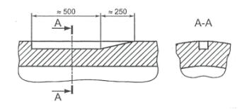 Стальной ресивер, минимальной длиной в два раза превышающей длину испытуемой трубы, и объемом, в три раза большим объема испытуемой трубы. Внутренний диаметр присоединительного участка ресивера должен иметь диаметр больший или равный внутреннему диаметру испытуемой трубы. Система для создания давления с погрешностью ±2% от заданного давления в испытуемой трубе и стальном ресивере. В качестве среды испытания используют азот или воздух. Оборудование для инициирования трещины, включающее: - фрезу для механической обработки продольной канавки на наружной поверхности трубы шириной ~10 мм, глубиной ~80% от номинальной толщины стенки трубы, длиной ~500 мм с равномерным уменьшением глубины канавки до выхода ее на наружную поверхность трубы в направлении стального ресивера на длине ~250 мм (рисунок 6). Длина трубы, на которой выполняется канавка, должна быть не менее 3 м. Центр канавки с постоянной глубиной должен находиться на расстоянии не менее 2 м от заглушаемого конца трубы; Размеры в миллиметрах