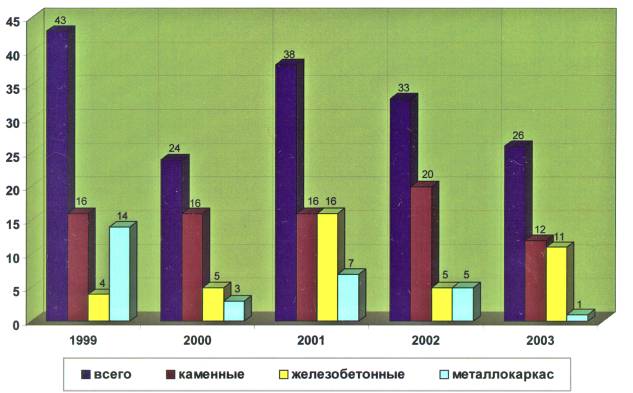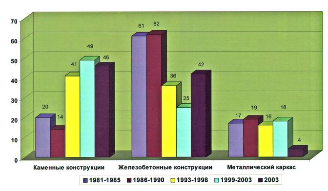 Диаграмма 3. Аварии зданий и сооружений в различных конструктивных решениях, произошедшие за период 1999-2003 г.г.