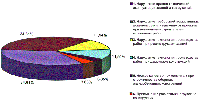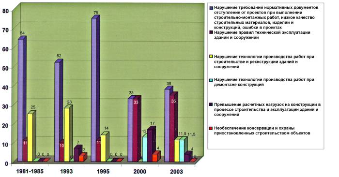 ВВЕДЕНИЕТехнический анализ причин аварий зданий и сооружений, зарегистрированных на территории Российской Федерации в 2003 году, подготовлен общероссийским общественным Фондом "Центр качества строительства". Анализ проведен на основании донесений, актов расследования причин аварий местными и техническими комиссиями, других документов и материалов, представленных в Госстрой России и в Минпромэнерго России в установленном порядке территориальными органами Госархстройнадзора России. Расследование причин аварий производилось в соответствии с Положением о порядке расследования причин аварий зданий и сооружений на территории Российской Федерации, утвержденным приказом Минстроя России от 6 декабря 1994 г. № 17-48, зарегистрированным в Минюсте России 23 декабря 1994 г. (регистрационный номер 761). Согласно данному Положению под аварией понимается обрушение, повреждение здания, сооружения в целом, его части или отдельного конструктивного элемента, а также превышение ими предельно допустимых деформаций, угрожающих безопасному ведению работ и повлекших за собой приостановку строительства (эксплуатации) объекта или его части. В понятие аварии входит также обрушение или повреждение здания, сооружения, произошедшие в результате природно-климатических воздействий (землетрясение, ветровой напор, снеговая нагрузка и т. д.), интенсивность которых не превышала расчетных значений. Такого рода аварии происходили и происходят во всем мире. Меняются только причины и характер аварийных ситуаций. Отмечающийся в большинстве стран рост числа аварий со значительными человеческими жертвами объясняется увеличением количества строящихся зданий сложных форм с большепролетными конструкциями, применением недостаточно изученных и проверенных на практике новых конструктивных схем и материалов при отставании нормативной базы и недостаточной подготовленности участников строительства. Опыт расследования причин аварий зданий и сооружений показывает, что они являются следствием нарушения требований нормативных документов при выполнении проектно-изыскательских и производстве строительно-монтажных работ, изготовлении строительных материалов, конструкций и изделий. Последствия указанных нарушений усугубляются несоблюдением норм и правил технической эксплуатации зданий и сооружений. Как правило, аварии являются следствием невыгодного сочетания нескольких из указанных факторов. Каждое в отдельности нарушение в большинстве своем не могло представлять угрозы зданию, сооружению, поэтому в настоящем техническом анализе при классификации аварий по основным признакам приводятся нарушения, которые явились основными причинами аварий. В бывшем СССР до 1981 года данные об авариях, произошедших на территории страны, не публиковались. С 1981 года такие данные стали готовиться Государственной строительной инспекцией Госстроя СССР для служебного пользования. В 1991-1992 годах регистрация аварий практически не проводилась, что было связано с распадом союзных структур управления строительным комплексом. С 1993 по 2003 год регулярный учет аварий, происходящих на территории Российской Федерации, проводила Главная инспекция Госархстройнадзора России. До 2002 года она же занималась и анализом материалов их расследования. Ежегодно готовился технический обзо