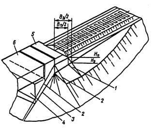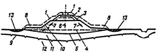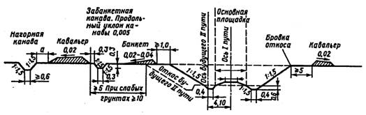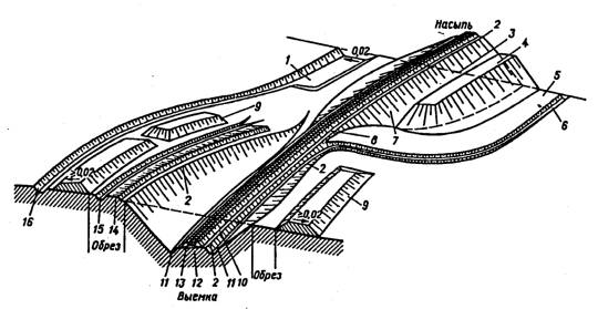 Элементы земляного полотна и связанные с ним устройства: 1 - резерв; 2 - бровка; 3 - основание насыпи; 4 - контрбанкет; 5 - берма; 6 - водоотводная продольная канава; 7 - откос; 8 - нулевое место; 9 - кавальер; 10 - обочина; 11 - кювет; 12 - основная площадка; 13 - сливная призма; 14 - банкет; 15 - забанкетная канава; 16 - нагорная канава устройства для отведения поверхностных вод (лотки, кюветы, забанкетные и нагорные канавы у выемок; продольные канавы у насыпей и нулевых мест); сооружения для перехвата и отведения грунтовых вод (закрытые дренажи различных конструкций, углубленные открытые канавы, каптажные устройства); защитные сооружения, построенные для сохранения земляного полотна от повреждений или разрушений (подпорные стены, волноотбоиные стены, волногасители, струенаправляющие дамбы, шпоры, запруды и другие сооружения); укрепительные сооружения (плитные противо-размывные покрытия, отсыпки горной массы, анкерные крепления скальных пород); сооружения для защиты земляного полотна от опасных природных явлений (противоселевые, противооползневые комплексы сооружений, про-тиволавинные, противообвальные и т. п.). 4. Настоящая Инструкция устанавливает виды, периодичность, сроки и порядок осуществления надзора за земляным полотном, включая современные методы обследования, требования к конструкциям земляного полотна и его сооружениям; состав работ по текущему содержанию земляного полотна и его сооружений, в том числе в сложных инженерно-геологических условиях, особенности текущего содержания деформирующихся участков земляного полотна; условия назначения капитального ремонта земляного полотна; основные мероприятия по капитальному ремонту и усилению земляного полотна и его сооружений, выполняемые при планово-предупредительных ремонтах верхнего строения пути. Настоящая Инструкция включает классификацию дефектов, повреждений и деформаций земляного полотна, причины их образования и признаки обнаружения. 5. При организации и выполнении работ по содержанию земляного полотна и его сооружений наряду с настоящей Инструкцией следует выполнять требования Правил технической эксплуатации железных дорог Российской Федерации, Инструкции по сигнализации на железных дорогах Российской Федерации, Инструкции по движению поездов и маневровой работе на железных дорогах Российской Федерации, Инструкции по текущему содержанию пути, Инструкции по обеспечению безопасности движения поездов при производстве путевых работ, Инструкции по содержанию искусственных сооружений, Инструкции по содержанию земляного полотна и технике безопасности при производстве работ на скально-обвальных участках железных дорог, Инструкции по содержанию земляного полотна и технике безопасности работ на селеопасных участках, Инструкции по текущему содержанию железнодорожного пути в карстоопасных районах, Правил техники безопасности и производственной санитарии при производстве работ в путевом хозяйстве, Положения о системе ведения путевого хозяйства на железных дорогах Российской Федерации, Правил безопасности для работников железнодорожного транспорта на электрифицированных линиях и других нормативных документов Министерства путей сообщения Российской Федерации, 6. Особое внимание при содержании земляного полотна должно уделяться состоянию водоотводных, укре
