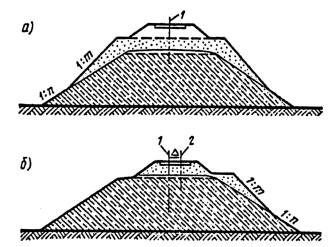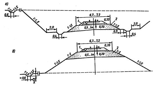 Рис. П.3.6. Поперечные профили земляного полотна из глинистых грунтов по нормам СТН Ц-01-95: а - выемки; б - насыпи; 1 - двухслойная балластная призма; 2 - защитный слой из дренирующего грунта