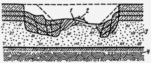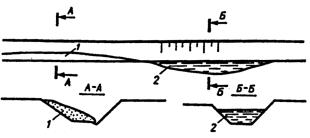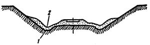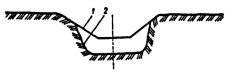 Глубокая выемка:1- типовая балластная призма; 2 - неочищенный балластный
