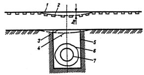 На пересечении с кюветами кабели следует прокладывать на расстоянии не менее 0,5 м ниже дна кювета с устройством защиты асбестоцементными трубами, железобетонными плитами или кирпичом. При пересечении кабелей с водоотводными лотками в зависимости от конструкции они должны прокладываться в асбестоцементных или металлических трубах, либо в железобетонном желобе, как правило, ниже дна водоотводного лотка на 0,25 м.