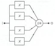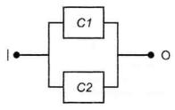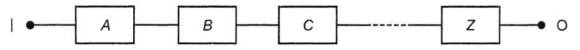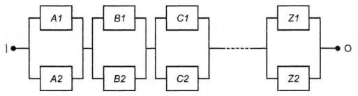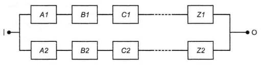½ - входной порт, О - порт вывода; А, В, С, Z- блоки системы Структурные схемы этого типа называются последовательными структурными схемами надежности. Другой тип структурной схемы применяют в случае, когда отказ одного компонента или блока не влияет на работоспособность системы в соответствии с определением отказа системы. Если в этом случае вся цепочка дублирована, то структурная схема имеет вид, показанный на рисунке 2. Если дублирован каждый блок в цепочке, структурная схема имеет вид, показанный на рисунке 3.