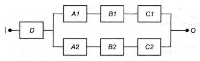Структурные схемы этого типа называются параллельными структурными схемами надежности. Структурные схемы, используемые для описания надежности системы, часто являются комбинацией последовательных и параллельных соединений. Такие структурные схемы можно построить, если рассмотреть систему, состоящую из дублированной цепочки, включающей три повторяющихся элемента А, В и С и общий элемент питания D. Итоговые структурные схемы представлены на рисунках 4 и 5.