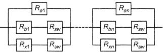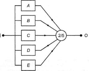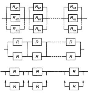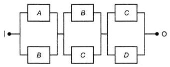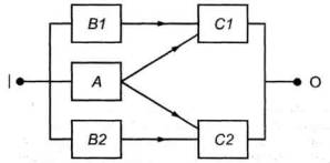 Из-за статистической независимости отказ любого блока не должен повышать вероятность отказа любого другого блока системы. В частности, отказ дублированного блока не должен влиять на работу источников питания и источников сигнала системы. На практике встречаются системы, для работы которой необходимо функционирование т или более из п элементов, соединенных параллельно. Структурная схема такой системы имеет вид, показанный на рисунках 6, 7. Таким образом, структурная схема, изображенная на рисунке 6, для работы системы допускает отказ не более одного элемента. Большинство структурных схем надежности легко понятны, а требования к работе системы - очевидны. Однако не все структурные схемы являются комбинациями последовательных или параллельных систем. Пример такой структурной схемы представлен на рисунке 8.