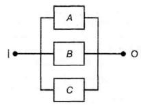 Вышеупомянутый метод допускается применять для проверки формул (5)-(7). 8.1.2 Использование Булевых таблиц8.1.2.1 Общие положенияПути работоспособности, изображенные с помощью структурной схемы надежности, могут быть описаны Булевыми формулами. Например, три элемента A, В и С, соединенные параллельно (для работы системы достаточно одного работоспособного элемента), могут быть представлены структурной схемой надежности, изображенной на рисунке 13, или описаны Булевым выражением: где SS - событие, состоящее в том, что система находится в работоспособном состоянии; А, В и С - события, состоящие в том, что компоненты А, В и С находятся в работоспособном состоянии.