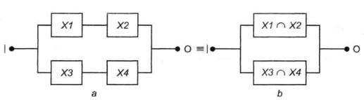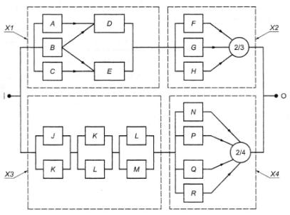 Рисунок 17 Приведенная на рисунке 17 структурная схема может быть упрощена до изображенной на рисунке 18а путем оценки надежности четырех блоков X1, Х2, Х3, Х4 в соответствии с 8.1, 7.2.3, 8.2 и 7.2.3 соответственно. Структурная схема, изображенная на рисунке 18а может быть редуцирована до структурной схемы, изображенной на рисунке 18b.