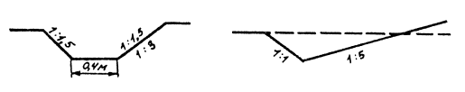 Рис.17. Элементы открытой системы водоотвода Для обеспечения нормальной эксплуатации городских улиц во время дождей, таяния снега глубина наполнения лотка ограничивается - она не должна превышать 4-5 см от верха бортового камня. Проезжая часть не должна затапливаться на ширину более 2-3 м. Вообще открытые канавы на территории города нежелательны. Но при открытой системе водоотвода они устраиваются. Форма канав обычно трапециевидная: наименьшая ширина по дну - 0,3 м, наименьшая глубина - 0,4 м. Наибольшая глубина воды в канавах в пределах города -1м. Возвышение бровки над наивысшим горизонтом воды должно быть Не менее 0,2 м. Минимальный продольный уклон по дну канавы - 0,005. В южных районах (IV и V климатических зонах) можно минимальный продольный уклон уменьшить до 0,3%. В городах канавы обычно устраивают с укрепленными откосами и дном. Типы укрепления: мощение камнем по грунту или по щебню в один слой; крепление плитами - бетонными или каменными (тесанными); асфальтирование откосов и дна; бетонное укрепление - монолитное, сборное, железобетонное (монолитное, сборное). Крутизна откосов принимается в зависимости от вида грунта и крепления откосов: Таблица 8Допустимая крутизна откосов