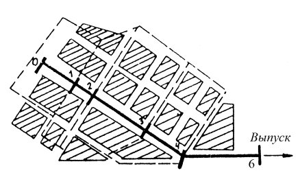 Смотровые колодцы обычно устраивают по типовым чертежам. При значительных продольных уклонах местности на трассе коллектора устраиваются быстротоки, водобойные колодцы или применяются чугунные или стальные трубы. 7. ВЫПУСКИ ВОДОСТОЧНОЙ СЕТИПо санитарным соображениям, выпуски водосточной сети желательно устраивать вне границ застройки города, ниже его по течению. Но это не всегда экономически выгодно. Устройство выпусков на территории города позволяет: уменьшить площадь бассейнов (увеличивая их число); соответственно уменьшить размеры основных коллекторов каждого бассейна; вести строительство водосточной сети отдельными участками в соответствии с очередностью застройки районов города. Однако в любом случае необходимо учитывать санитарные требования. Выпуск на водосточной сети обычно устраивается незатопленным. Но иногда (по архитектурным соображениям) делают и затопленные выпуски. Тогда шелыга трубы должна быть на выходе ниже уровня воды и толщины ледяного покрова. 8. ГИДРОЛОГИЧЕСКИЙ РАСЧЕТ КОЛЛЕКТОРАГидрологическим расчетом определяются расчетные расходы на расчетных участках и в расчетных сечениях коллекторов водосточной сети. Каждый коллектор разбивается на расчетные участки. Каждый участок рассчитывается на пропуск расхода, формирующегося на низовом конце этого участка. Схема разбивки коллектора на участки показана на рис.11. Границы участков определяются местами присоединения боковых коллекторов или изменением уклонов. Диаметр трубы коллектора (отверстие) определяется по расходу в низовом сечении. Рис. 11. Схема разбивки коллектора на расчетные участки Расчетный расход от дождевых вод находят по формуле