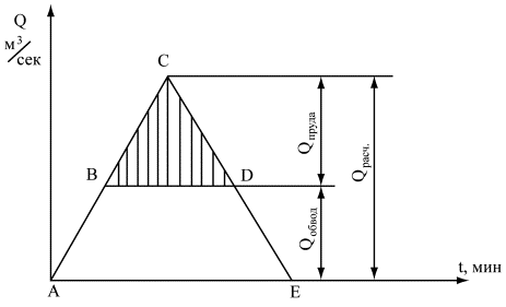 Рис.15. Регулирующий пруд и обводной коллектор Расположение, форма и размеры пруда - существующего или искусственного - обычно устанавливаются архитектурно-планировочным решением территории города. Очень часто планировочные условия определяют или сильно влияют на емкость пруда и его регулирующую способность. Тем не менее, во всех случаях, должны быть учтены требования водосточной сети города. Может быть запроектирован не один пруд, а каскад прудов в направлении падения рельефа. Проектирование регулирующих прудов включает: 1. Определение емкости и габаритов (размеров пруда). 2. Установление нормального к максимального горизонтов. 3. Определение расхода обводного коллектора и расчет регулирующей емкости пруда. 4. Определение расчетного расхода коллектора ниже пруда. Уравнение баланса стока с учетом регулирующего влияния пруда имеет следующий вид: W=Wпр+Wобв, м3, где W - полный объем стока, Wпр - объем воды, задерживаемый прудом, Wобв - объем воды, пропускаемый по обводному коллектору. Размеры пруда и его емкость в основном определяются планировочными требованиями, а они устанавливаются на основе решений, принятых при разработке генплана или проекта детальной планировки. В зависимости от этих параметров выполняется гидрологический расчет регулирующего пруда. Типовой гидрограф дождя обычно изображают в виде, показанном на рис.16. Он показывает объем стока, расчетный расход, объем воды, сбрасываемой в пруд, пропускаемый через обводной коллектор. Используется гидрограф и для определения ряда коэффициентов, применяемых в расчете. Рис.16. Гидрограф стока Полный объем стока определяют по формуле W=60∙Qp∙tp, м3, где Q - незарегулированный расход (т.е. расход, поступающий к месту расположения пруда выше расположенной части бассейна стока), м3; tр - расчетное время стекания воды с бассейна до пруда, мин; W - объем стока воды за период дождя или паводка. Регулирующие пруды рассчитываются на дождевой сток, так как интенсивность дождя обычно значительно выше интенсивности снеготаяния и поэтому расход дождевого стока превышает расход талых вод. Регулирующая емкость пруда, т.е. объем воды, задерживаемый прудом, может быть определен по формуле Wпр=60∙K∙Qp∙tp, м3, где Qp - расчетный расход в месте водовыпуска из коллектора в пруд; tp - расчетное время стока воды со всего бассейна до места водовыпуска воды в пруд; K - коэффициент, зависящий от коэффициента регулирования α. Объем воды, задерживаемой прудом, может быть определен и иначе. По условиям рельефа, в зависимости от архитектурно-планировочных требований, может задаваться отметка нормального (т.е. обычного в период между дождями) уровня воды и максимального. Разность этих отметок позволяет подсчитать объем воды, который может быть удержан прудом. Соотношение полного объема стока и объема воды, задерживаемого прудом, позволяет подсчитать значение коэффициента регулирования: