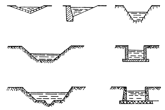 Зарегулированный расход, т.е. расход, пропускаемый по обводному коллектору, определяется с учетом коэффициента регулирования: Qобв= α∙Qp. Расчет коллектора ниже регулирующего пруда производится из условия пропуска расхода, определяемого из выражения Q=α∙Qp+Qн+Qосвоб, где α∙Qр - расход, пропускаемый по обводному коллектору без сброса воды в пруд; Qн - расчетный расход с площади, расположенной ниже пруда (этот расход определяется без учета времени притока воды с площади выше пруда); Qосвоб - средний расход при освобождении пруда (определяется как для водослива). Освобождение пруда от сброшенного объема воды должно осуществляться не более чем за 24 часа после окончания дождя. При заполнении пруда талыми водами дополнительный объем воды должен сбрасываться в коллектор ниже пруда не позднее утра следующего за наполнением дня. Минимальная глубина пруда (при нормальном уровне воды) не должна быть менее 1,5 м. Береговые откосы пруда укрепляются в соответствии с общим уровнем благоустройства и назначением территории (набережные, одернованные откосы и др.). При проектировании прудов следует предусматривать водообмен в них в летнее время. Расчетная повторяемость сброса воды в декоративные пруды допускается 1…5 раз в год. 12. ОТКРЫТАЯ СИСТЕМА ВОДООТВОДАДалеко не всегда и не везде существует закрытая система водоотвода, включающая: лотки, кюветы и канавы, а иногда и крупные каналы на территории города. Лотки служат для направления стекающей воды с территории кварталов и микрорайонов, с территории зеленых насаждений к кюветам и канавам. Кюветы являются обычно элементами дорог, канавы служат для сброса и отведения в водоемы или иные места поверхностных вод (дождевых и талых). В открытой системе водоотвода с территории города канавы являются основным элементом. При неблагоприятных природных условиях (при наличии оползней, оврагов, при крутом рельефе) лотки и канавы применяют в качестве одного из мероприятий по ограждению склонов от размыва, по организации) стока поверхностных вод на откосах. В этих случаях канавы обычно играют роль нагорных, перехватывающих верховой сток. Поперечное сечение лотков, кюветов и канав показано на схемах рис.17.