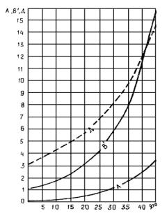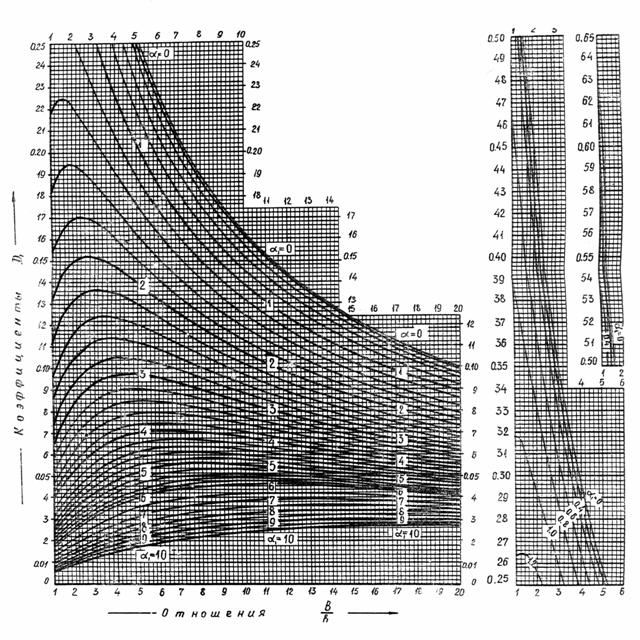 Рис.4 3.9. На косогорных δσz1 = δz cosβ- τхz sinβ; τx1z1=δz sinβ+τxz cosβ, (9) 3.10. Среднее давление под подошвой фундамента трубы, определяемое для проверки по второму условию п.3.1, рассчитывают по формуле δ= CγH3+p+q (10) где С - коэффициент, определяемый в соответствии с приложением 8 CН 200-62; H3 - высота засыпки от верха врубы до подошвы шпал или до верха дорожного покрытия, м; р - нормативное давление от собственного веса элементов трубы, включая фундамент, т/м2; q - нормативное давление грунта на звенья трубы от временной подвижной нагрузки, т/м2 (СН 200-62). 3.11. Нормативное сопротивление основания определяется по формуле RH = (Авφ+ В1Н1 )γн1 + Dc т/м2 (11) где А, В1, D- безразмерные коэффициенты, зависящие от угла внутреннего трения грунта основания, определяемые по табл.7 СНиП II-Б.1-62 или по рис.5; вφ - ширина подошвы фундамента трубы, м; H1=hφ+0,5H - условная глубина заложения фундамента трубы, м; hφ - глубина заложения фундамента, м; γH1 - средневзвешенное значение объемного веса грунта рядом с трубой (на высоте H1), т/м3.
