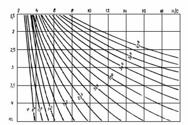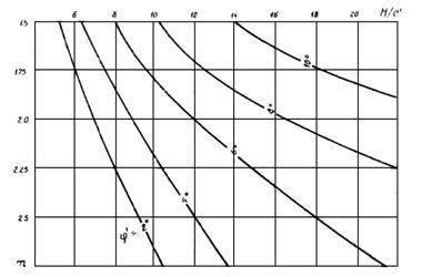 В случае, если коэффициент стабильности оказывается .меньшим единицы, то принимают проектные решения, обеспечивающие Ко≥1 (замена грунта основания, уположение откосов насыпи, устройство берм и т.п.), либо трубу проектируют с учетом возможных подвижек окружающего грунте (применяют фундамент с наклонными сваями, объединяют плиту свайного ростверка и др.). 3.4. При предварительных расчетах: 1. можно определить высоту Н и заложение m откосов насыпи, удовлетворяющих (при заданных φ и с) условию KОmin = 1 , при помощи графиков (рис.2). При построении графиков объемный вес грунта насыпи принят равным 1,8 т/м3, объемный вес грунта основания - 1,0 т/м3 (с учетом взвешивающего действия грунтовой воды).