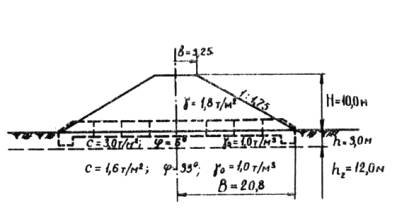 4. ПРЕДЕЛЬНО ДОПУСТИМЫЕ ДЕФОРМАЦИИ ВОДОПРОПУСКНЫХ ТРУБ4.1. Предельно допустимую осадку труб под осью насыпи (п.1.4.) определяют, исходя из условия свободного пропуска воды по трубе в период эксплуатации, по формуле Sдоп = Δдоп+0,25 IL (14) где Δдоп = 0,5 (S+iL) - предельно допустимый строительный подъем; I - продольный уклон трубы; L - полная длина трубы, см. В случае если не соблюдается первое условие (п.3.1.), то принимают проектные решения, обеспечивающие уменьшение осадки трубы, например, устройство свайных фундаментов, либо решения, предусматривающие увеличение уклона трубы. 4.2. Строительный подъем рассчитывается в соответствии с ожидаемыми осадками по формуле Δ = S -0,25 IL (15) Во всех случаях должно соблюдаться условие Δ ≤ Δдоп (16) Очертание лотка трубы со строительным подъемом может быть принято по круговой кривой. 4.3. Строительный подъем не устраивают у труб, в основании которых залегают практически несжимаемые грунты - щебенистые, галечниковые, плотные твердые глины и другие, а также у труб, расчетные осадки которых не превышают 0,25 IL. 4.4. Ограничение допустимого раскрытия межсекционных швов с удлинением трубы (растяжка) обеспечивается при выполнении требований пп.3.1-3.9. 4.5. В случае, когда глубина заложения фундамента оголовков превышает глубину заложения фундамента средней части трубы в 1,5 раза и более лоток трубы у выходного оголовка должен устраиваться со ступенчатым понижением в месте перехода к более глубокому фундаменту. Величину понижения (уступа) определяет в зависимости от высоты насыпи и разницы высот фундаментов оголовка Δог г и средней части трубы hφ по формуле. Δог = 0,3Н(hог-hφ) см, (17) но не менее 5 см, В формуле (I7) значения Н, hог, hφ приняты в метрах. ПРИМЕРЫ РАСЧЕТАПример I. Проверка стабильности основания по схеме глубокого сдвига (п.3.3) Исходные данные: Н - 10,0м, в - 3,25м; В = 20,8м; γ - 1,8т/м3; основание-первый слой h - 3,0м; суглинок текучепластичный водонасыщенный; γ0 = 1,0м; φ = 6о; (tgφ = 0,105); с = 3,0т/м2; второй слой: h - 12,0м; песок мелкий заиленный водонасыщенный; γ0 - 1т/м3; φ = 33° (tgφ = 0,649); с - 1.6т/м2 (рис.7).