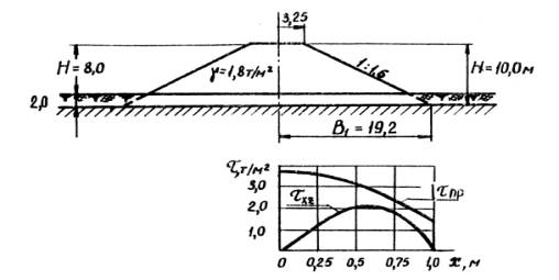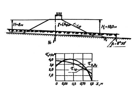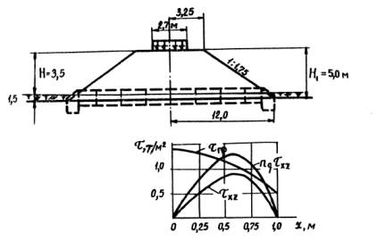 Строят эпюры τпр и τx1z1, как показано на рис.9. Вывод. Так как на некоторых участках τпр <τx1z1 сопротивление сдвигу недостаточно. Возможна растяжка трубы. Пример 4. Проверка по схеме плоского сдвига с учетом временной нагрузки. Исходные данные: Н = 3,5 м; толщина слабой прослойки 1,5 м; Н1 = 1,5,0м, В1 = 12 м; γ = 1,8 г/мэ; ξ = 0,333; основание - слабая прослойка, φ = 6о; (tgφ = 0,105); с = 0,5 т/м2. Расчет производят по формулам (5-8).