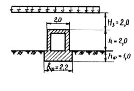 Рис.10 Вывод. Так как во всех точках τnp > τxz, а на одном из участков τпр < nqτxz, растяжка трубы может возникнуть под действием суммарного силового воздействия (от собственного веса насыпи и от подвижной железнодорожной нагрузки). Непосредственно после отсыпки насыпи растяжка трубы не ожидается. Пример 5. Проверка основания под подошвой фундамента (пп.3.10 и 3.11). Исходные данные: труба прямоугольная железобетонная (рис.11) на фундаменте мелкого заложения; Н = 4м; высота засыпки H3 = 2,0м; γ = 1,8т/м3; lgφ = 0,577; μ = 0,333; φ = 9°, c = 1,0т/м2; вес элемента трубы р = 3,32т/м . Решение.