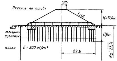 х/ Подошва фундамента. хх/ Нижняя граница сжимаемой толщи. 5. Определяют строительный подъем по формуле (15): Δ = 17,7-0,25·0,005·3500 = 13,3см Δ = 13,3<Δдоп = 17,6. Вывод. Труба может быть построена без свай. Расчетные осадки не превзойдут допустимых. Средняя ордината строительного подъема равна 13,3см. Пример 7. Расчет осадок трубы со свайным фундаментом (пп.3.15 и 3.18). Исходные данные: труба прямоугольная бетонная отверстием 2,0 х 2,0м; L = 45,6м; i = 0,010; фундамент свайный, длина свай 11,0м (от лотка трубы до острия свай); Н = 12,0м, в - 3,25м, В = 22,8м, К= 0,86, γ =1,8т/м3; основание до отметки 10,0м - суглинки текучие и текучепластичные водо-насыщенные; γ = 1,0т/м3; с отметки 10,0м и ниже - песок плотный; Е = 200кг/см2 (рис.12).