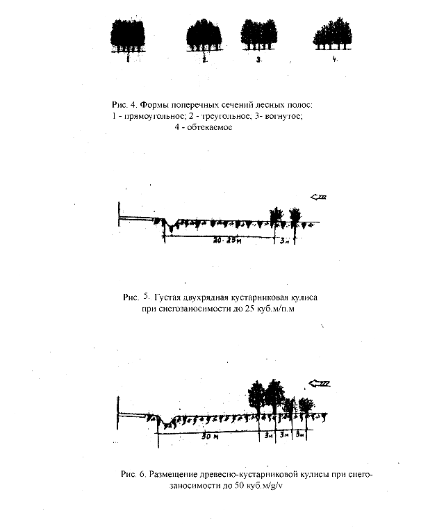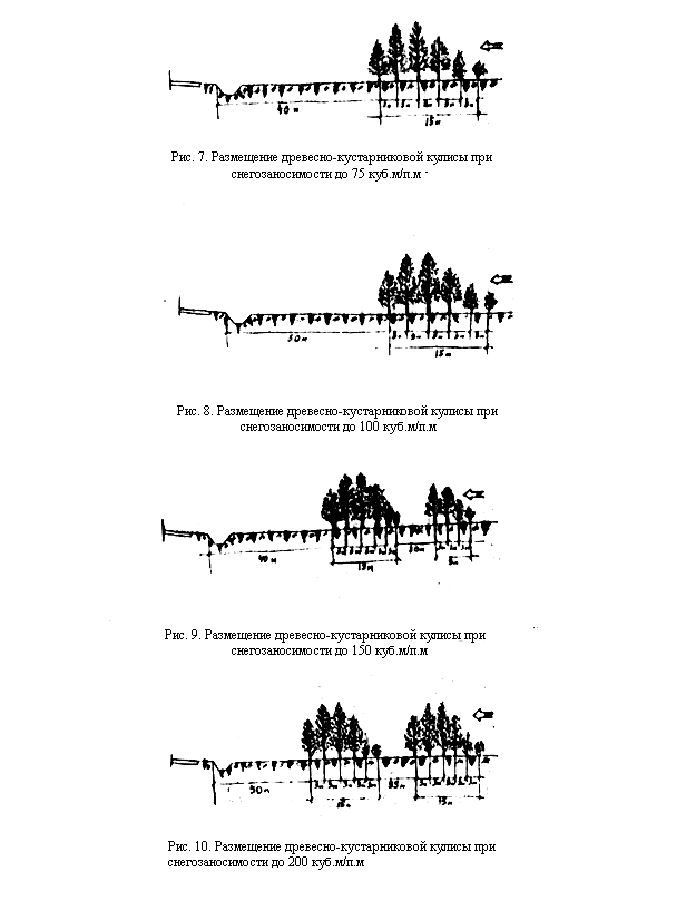 где L - ширина зоны отвода в которую входит ширина снегосборных кулис в метрах вместе с разрывами между ними, и расстояние от бровки земляного полотна до первого ряда снегозащитной полосы (X); S - площадь поперечного сечения снежного вала в годы наибольших заносов (кв.м) hр - высота рабочей части насаждений (средняя высота снежного вала в полосе). В зависимости от объёма снегозаноса древесные насаждения располагаются на снегосборном бассейне следующим образом. Для участков дорог с объемом снегозаноса до 25 куб.м/п.м рекомендуется густая двухрядная посадка кустарников на расстоянии 20-25 м от бровки земляного полотна (рис. 5). На участках дорог с объемом снегозаноса до 50 куб.м/п.м закладывается одна 4-рядная древесно-кустарниковая кулиса на расстоянии 30 м от бровки земляного полотна. При этом два ряда с полевой стороны устраивают из кустарников и два ряда с дорожной стороны - из густоветвистых низкокронных деревьев (рис.6). Надежной защитой для участков дорог с объемом снегозаноса до 75 куб.м/п.м служит 6-рядная древесно-кустарниковая кулиса, заложенная на расстоянии 40 м от бровки земляного полотна дороги. В такой кулисе кустарники занимают крайние ряды (рис.7). На участках дорог со снегозаносом до 100 куб.м/п.м закладывают древесно-кустарниковую кулису на расстоянии 40 м от бровки земляного полотна в сочетании с 2-рядной посадкой кустарников, размещенных на расстоянии 15м от кулисы в сторону поля (рис.8) Участки дороги со снегозаносом до 150 куб.м/п.м надежно защищает система из двух древесно-кустарниковых кулис, в которой ближе к дороге располагается шестирядная кулиса на расстоянии 40 м от бровки земляного полотна, а со стороны поля 4-рядная кулиса на расстоянии 30 м от 6-рядной кулисы (рис.9). Для участков дорог со снегозаносом до 200 куб.м/п.м закладывают систему из двух 6-рядных древесно-кустарниковых кулис с разрывом между ними в 35 м. При этом ближайшую к дороге кулису размещают на расстоянии не ближе 50 м от бровки земляного полотна (рис.10). Для таких снегозащитных насаждений рекомендуются ветвистые древесные породы с низкоопущенной кроной и высокорастущими кустарниками. Небольшое количество рядов в кулисах компенсируется загущением посадки в рядах с расстоянием между стволами через 0,4 м и уширением междурядий до 2,5-3 м, что обеспечивает повышение. площади питания растений и вызывается также необходимостью механизации обработки почвы и ухода за полосами. Опытная проверка характера снежных отложений у экспериментальных лесных полос вдоль автомобильных дорог свидетельствует о надежной защите их при слабой степени заносимости до 200 куб.м/п.м. В: условиях севера Казахской ССР автомобильные дороги проходят, в основном, по равнинным участкам степей, где снег переносится на большие расстояния, и, следовательно, дороги подвергаются более значительным заносам. В таких условиях объёмы снежных отложений на автомобильных дорогах достигают 300-400 м3/ п.м. а в более снежные зимы - 600-700 м3/ п.м. с максимумом на отдельных участках до 1200 м3/п.м. Плотные конструкции полос в таких условиях, как правило, быстро зарабатываются. Частые позёмки и метели сильно уплотняют снег в заработанных полосах, особенно при примешивании к нему земляной пыли, являющейся результатом зимней эрозии почв. Это обстоятельство усугубляет вредное воздействие снежных сугробов на сохранность 