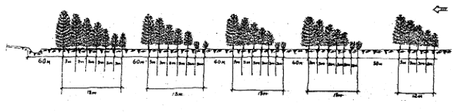 Рис.13 Размещение древесно-кустарниковых кулис при очень сильной заносимости свыше 600 м3/п.м Надежной защитой на сильно заносимых участках дорог о объемом сногозаноса от 400 до 600 \м3/п.м. будет служить система кулис на наветренной, двух промежуточных и придорожной кулис. Расстояние между наветренной и первой промежуточной кулисами принимается в 80 м, а между последующими промежуточными и придорожной кулисами - 60 м. Расстояние от полотна до опушки придорожной кулисы также должно быть равным 60 м (рис.12). Очень сильно заносимые участки дорог с объем снегозаноса свыше 600 м3/ п.м. защищаются системой кулис на наветренной, 3-5 промежуточных и придорожной кулис с размещением, аналогичным предыдущему варианту. Увеличение числа промежуточных кулис на очень сильно заносимых участках дорог зависит от объема снегоприноса. При объеме снегоприноса от 600 до 800 м3/п.м рекомендуются три промежуточные кулисы, при 800-1000 м3/п.м - 4 кулисы и при I000-1200 м3/п.м -5 кулис (рис 1З). Для создания древесных кулис предлагаемых конструкций рекомендуется следующий ассортимент пород. В наветренной кулисе в первые два наветренные ряда высаживаются такие породы, как вяз гладкий, клен ясенелистный, клён татарский, рябина сибирская, черемуха сибирская, облепиха, боярышник сибирский, яблоня сибирская, а в следующие три ряда - берёза тополь, лиственница сибирская. В промежуточные кулисы, кроме этих пород, с наветренной стороны вводятся два ряда таких низких кустарников как вишня степная, канадская, песчаная, смородина черная, золотистая, спереи городчатая, узколистная зверобоелистная; бобовник, чилига, дрон красильный. В придорожную кулису в опушечные ряды вводится акация желтая, шиповник, можжевельники, жимолость татарская, в приопушечные - клен ясенелистный, клен татарский, вяз гладкий, вяз мёлколистный, рябина сибирская, черемуха сибирская, облепиха, боярышник сибирский яблоня сибирская, и в центральные - береза, тополь, лиственница сибирская. IX. Экономическая эффективность снегозащитных насаждений рекомендуемых конструкций.Создание снегозащитных насаждении рекомендуемых конструкций окупается за счет снижения затрат на зимнее содержание дорог, уменьшении транспортных потерь от простоев и снижения скорости движения автомобилей, вызываемых снежными заносами, за счет снижения затрат по уходу за насаждениями, связанных с отсутствием снеголома в кулисах и экономией посадочного материала и пахотно-пригодных площадей благодаря рациональному размещению насаждений вдоль дорог. По данным дорожно-эксплуатационных управлений, затраты на зимнее содержание заносимых участков дорог при прежних конструкциях снегозащитных насаждений в северных районах Казахстана достигают 400-500 рублей на километр дороги, снегозащитные насаждения рекомендуемых конструкций надежно защищают дороги от заносов и снижают расходы на зимнее содержание дорог не менее, чем на 200 рублей на километр дороги. Величина транспортных потерь от простоев и снижения скорости движения автомобилей, вызываемых снежными заносами, по данным расчета отдела эксплуатации дорог Казахского филиала СоюздорНИИ, при интенсивности движения 500 автомобилей в сутки, составляет более 200 рублей на одном километре, дороги в каждый снегозаносимый день. Следовательно, на участках, защищённых прежними конструкциями снегозащи