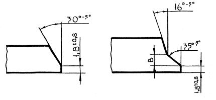 Рис. 1. Схема разделки кромок труб: а - с толщиной стенки до 16 мм; б - с толщиной стенки более 15 мм Примечание. Размер В зависит от толщины стенки трубы и для труб с толщиной стенки 15,7 мм составляет 7 мм. 2.4. Сборка секций труб в плеть, включая сварку первого (корневого) слоя шва и второго ("горячего прохода"), производится в три этапа: первый - зачистка кромок труб перед сборкой я сваркой; второй - центровка секций труб с ниткой трубопровода при помощи внутреннего центратора ЦВ-144 и ручная электродуговая сварка стыка первым (корневым) слоем шва электродами с целлюлозным видом покрытия, включая предварительный подогрев; третий - сварка второго ("горячего прохода") слоя шва электродами с целлюлозным видом покрытия. 2.4.1. Кромки и прилегающие к ним внутреннюю и наружную поверхности секций труб зачищают до чистого металла на ширину не менее 10 мм шлифовальными машинками с абразивными кругами. 2.4.2. Подготовленную секцию перемещают трубоукладчиком и пристыковывают к нитке трубопровода. Внутренний центратор ЦВ-144 выдвигают из полости нитки трубопровода и устанавливают так, чтобы жимки первого ряда после полного разжатия были скрыты за её кромкой. Зазор в стыке должен быть 1,5 - 2,5 мм. 2.4.3. Предварительный подогрев осуществляется на ширину не менее 150 мм у каждой кромки газовыми подогревателями ПС-1421, укомплектованными шестью баллонами БГ-П-50. Подогреватель ПС-1421 питается горючим газом из емкости PC-1600. Вспомогательным оборудованием для установки ПС-1421 являются бензиноэлектрический агрегат АБ-40 и две шлифовальные машинки мощностью по 1,9 кВт. Необходимость предварительного подогрева и его параметры определяют по табл. 6 и 7 ВСН 006-89 "Строительство магистральных, и промысловых трубопроводов. Сварка" в зависимости от эквивалента углерода стали, толщины стенки стыкуемых труб, температуры окружающего воздуха. 2.4.4. По окончании центровки производится сварка первого корневого слоя шва, при этом по обе стороны стыка, как и при сварке всех слоев шва, должны быть установлены инвентарные и страховочные опоры. Сварка корневого слоя шва осуществляется электродами с целлюлозным покрытием на постоянном токе обратной или прямой полярности в направлении сверху вниз без колебательных движений, при опирании конца электрода на кромки свариваемых труб. Скорость сварки корневого слоя должна быть в пределах 16-22 м/ч. Поддержание, достаточно высокой скорости сварки обусловлено формированием под дугой жидкой ванны. По окончании сварки всего корневого слоя шва внутренний центратор перемещается для осуществления центровки следующего стыка. Сваренный корневой слой шва немедленно обрабатывается абразивным кругом. 2.4.5. Сразу после обработки сваренного корневого слоя шва должен быть выполнен "горячий проход". Сварку "горячего прохода" выполняют на постоянном токе только обратной полярности при скорости сварки 18-20 м/ч одновременно 4 электросварщика. 2.4.6. Рекомендуемые значения сварочного тока при сварке корневого слоя шва и "горячего прохода" приведены в табл. 3. Таблица 3