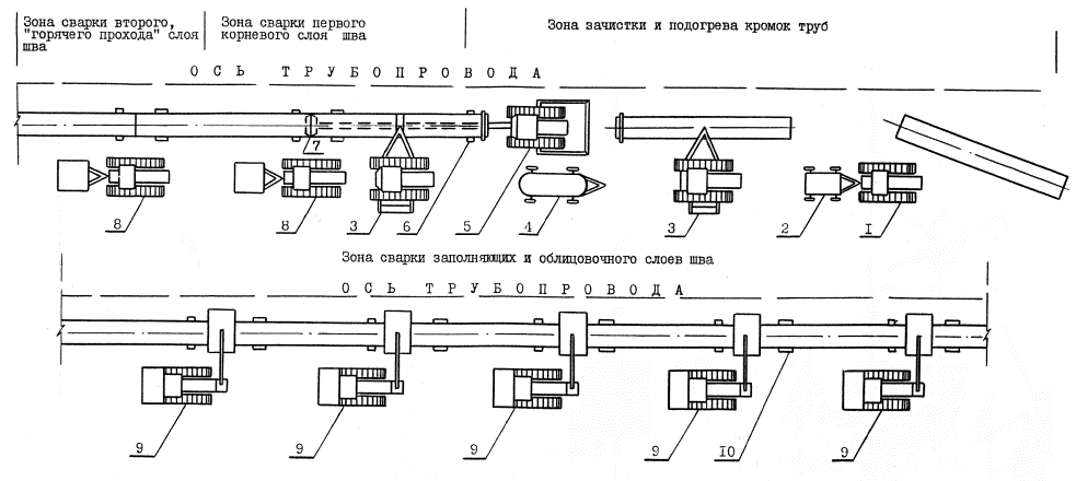 Рис. 2. Схема оборки и сварки трехтрубных секций в нитку: 1 - трактор T-I30; 2 - электростанция АДД-502У2; 3 - трубоукладчик К-594; 4 - емкость с горючим газом PC 1600; 5 - бульдозер ДЗ-27; 6 - страховочная опора; 7 - центратор внутренний ЦВ-144; 8 - энергетический агрегат АЭП-51; 9 - сварочная установка УС-41; 10 - инвентарная опора 3.7. В процессе сварки проверяют: соблюдение строгого режима сварки; порядок наложения слоев и их количество; правильность выбора электродов, применяемых для сварки всех слоев шва; время перерыва между сваркой первого корневого слоя и "горячего прохода"; качество зачистки корневого и каждого следующего слоев шва. 3.8. При осмотре сварного стыка проверяют: наличие на каждом стыка клейма сварщика или бригады; наличие на конце каждой плети ее порядкового номера; отсутствие наружных дефектов (трещин, незаплавленных кратеров и выходящих на поверхность пор); точность размеров сварных швов. 3.9. Сварные стыки, которые по результатам визуального контроля и обмера отвечают требованиям ВСН 006-89 и ВСН 012-88 (часть I), подвергаются неразрушающему методу контроля. 3.10. Сварные стыки подвергаются неразрушающему контролю в объёме и методами, указанными в проекте, в соответствии с требованиями ВСН 012-88 (часть I). Контроль качества сварных соединений неразрушающими методами производится работниками службы контроля (ПИЛ, специализированных управлений по контролю и т.п.). 3.11. При выполнении сварочных работ следует своевременно оформлять исполнительную производственную документацию и акты промежуточной приемки в соответствии с перечнем, представленным в ВСН 012-88 "Строительство магистральных и промысловых трубопроводов. Контроль качества и приемка работ" (часть II), в том числе: список сварщиков, составляемый службой главного сварщика, форма № 2.3; журнал сварки труб, который ведет производитель работ, форма № 2.6 (2.6 а); заключение по проверке качества сварных соединений физическими методами контроля, составляемое службой контроля качества, форма № 2.9; заключение о результатах механических испытаний контрольных и допускных сварных соединений, составляемое службой контроля качества, форма № 2.12. 3.12. Технические критерии и средства контроля операций приводятся в табл. 6. Таблица 6