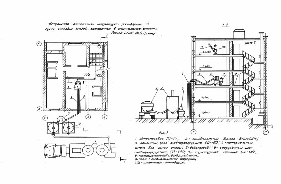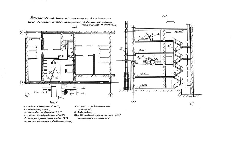 1. ОБЛАСТЬ ПРИМЕНЕНИЯ.1.1. Типовая технологическая карта (ТТК) разработана на производство работ по оштукатуриванию внутренних поверхностей стен и перегородок из кирпича и бетона штукатурными растворами, на основе гипсовых вяжущих со специальными добавками, улучшающими качества, растворов (адгезию к обрабатываемой поверхности, заглаживаемость, трещиностойкость и др.). Такие штукатурные растворы изготовляются централизованно в виде сухих гипсовых штукатурных смесей (СГШС). Приготовление товарного раствора из СГШС и нанесение его на обрабатываемую поверхность - механизированное. ТТК разработана на измеритель конечной продукции - 100 м2 поверхности стен и перегородок. 1.2. В состав работ, рассматриваемых картой, входят: подготовка поверхностей стен и перегородок под оштукатуривание; провешивание поверхностей, установка марок, устройство маяков; механизированное приготовление раствора и нанесение его на обрабатываемую поверхность в один слой толщиной до 2 см; разравнивание нанесенного штукатурного слоя правилом, и заглаживание поверхности металлическим полутерком; обработка откосов, лузг и усенков Кроме того, рассматриваются работы по доставке СГШC на объект и внутри объектное транспортирование ее к штукатурной машине. 1.3. Настоящая ТТК разрабатывается применительно к строительству пятиэтажного жилого здания с: эксплуатационной влажностью отделываемых помещений не более 90%. 1.4. При привязке ТТК к конкретному объекту и условиям строительства необходимо уточнить объемы работ и, с учетом этих объемов, калькуляцию затрат труда и количество средств механизации и инвентаря. 2. ОРГАНИЗАЦИЯ И ТЕХНОЛОГИЯ ВЫПОЛНЕНИЯ РАБОТ2.1. Подготовка объекта к производству штукатурных работ.До начала производства отделочных работ следует: закончить работы по монтажу строительных конструкций, смонтировать и опрессовать санитарно-технические разводки; смонтировать и опробовать скрытые электротехнические сети; подготовить устройства для сушки помещения в целях создания нормального температурно-влажностного режима в период отделки и до сдачи здания в эксплуатацию; подготовить помещения для складирования и эксплуатации материалов и оборудования; подготовить помещения для бытового обслуживания рабочих; установить грузовые подъемники; очистить помещения от строительного мусора В помещения, в которых будет эксплуатироваться оборудование, должна быть обеспечена подача воды и электроэнергии. Подготовка поверхностей к оштукатуриванию (очистка от пыли, грязи, жировых пятен, наплывов бетона и раствора) должна осуществляться способами, принятыми при выполнении обычной штукатурки. В зимнее время влажность подготовленной под отделку поверхности не должна превышать 8% при этом температура воздуха в помещении не должна быть менее плюс 8°С (на расстоянии 50 см от пола), относительная влажность воздуха допускается не более 70%. В летнее время при температуре воздуха более 23°С обрабатываемые, поверхности необходимо смачивать водой. При оштукатуривании бетонных гипсолитовых и других глянцевых поверхностей, последние необходимо предварительно загрунтовать 7%-ным раствором дисперсии ПВА. 2.2. Транспортирование СГШС к месту работ.СГШС, представляющая собой смесь гипсового вяжущего, добавок и наполнителей, изготовляется в заводских условиях. Гото