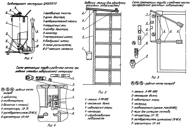 Оборудование для приготовления грунтовочных и клеящих составов может быть размещено в частично переоборудованной малярной станции CО-115. Помещение этой станции также может быть приспособлено для хранения используемых материалов. Расположение оборудования при обработке фасадных и интерьерных поверхностей пятиэтажного жилого дома приведено на рис. 3 и 4. Подготовка оборудования Перед началом работы проверяют исправность всех средств механизации, регулируют средства механизации на заданную производительность. Пневмоагрегат готовят к работе в следующем порядке: опустив ручку регулятора вниз, закрывают дозатор, с помощью фиксаторов устанавливают необходимый зазор щелевого отверстия сопла-распылителя в зависимости от фракции применяемого дробленого материала, подсоединяют резиновые рукава от сопла-распылителя к выходному штуцеру эжектора и от входного патрубка эжектора к компрессору, затем продувают рукава и пневмоагрегат сжатым воздухом. Емкость пневмоагрегата