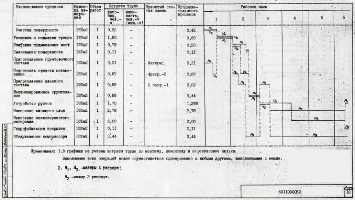 1. ОБЛАСТЬ ПРИМЕНЕНИЯТиповая технологическая карта (ТТК) предназначена для организации труда рабочих при выполнении работ по созданию декоративных покрытий в построечных условиях. Декоративное покрытие наносится на наружные (фасад) и внутренние (интерьер) поверхности жилых, общественных и культурно-бытовых зданий. Настоящая ТТК разработана, для применения при отделке пятиэтажного жилого дома. В этом случае отделке подлежат фасадные поверхности, а также поверхности стен лестничных клеток. Работа по отделке фасадных поверхностей производится с люлек, отделка стен лестничных клеток - с инвентарных подмостей. Декоративное покрытие состоит ив клеящей основы - полимерцементной или полимерминеральной пасты, наносимой на огрунтованное основание и слоя дробленого мелкозернистого материала (стеклянная, каменная крошка). При необходимости поверх декоративного покрытия наносят слой; гидрофобизирующего или закрепляющего покрытия. В состав работ по декоративной отделке зданий входят: устройство средств подмащивания; подготовка обрабатываемой поверхности (очистка, расшивка и подмазка трещин, шлифовка подмазанных мест, смачивание и устройство рустов); подготовка средств механизации; приготовление грунтовочного и клеящего составов; грунтование поверхности; нанесение, клеящего состава; нанесение мелкозернистого материала; гидрофобизация поверхности покрытия или закрепление готового покрытия бесцветным лаком. Работы выполняют при температуре воздуха не ниже плюс 10°С и не выше плюс 30°С, влажность обрабатываемой поверхности к началу работы не должна превышать 12 %. Работы выполняют по ровной бетонной или оштукатуренной поверхности с учетом требований действующих нормативных документов (ГОСТ 22753-77, СНиП 3.04.01-87). При привязке ТТК к другим объектам строительства уточняется объем работ и калькуляция затрат труда. 2. ОРГАНИЗАЦИЯ И ТЕХНОЛОГИЯ ВЫПОЛНЕНИЯ РАБОТСредства механизации Клеящий полимерминеральный состав наносится на обрабатываемую поверхность пистолетом-распылителем Р-68 конструкции ЦНИИЭП жилища, модернизированным распылителем конструкции ЦНИИОМТП (проект 2262.20.000) или меховым валиком вручную. Мелкозернистый дробленый материал наносят различными ручными крошкометами или пневмоагрегатом конструкции ЦНИИОМТП (проект 2481.00.000), работающим при давлении сжатого воздуха 0,01 МПа (0,1 кгс/см2) и подающим мелкозернистый материал с расходом 1,8-2,5 кг/мин. Пневмоагрегат для нанесения декоративных мелкозернистых