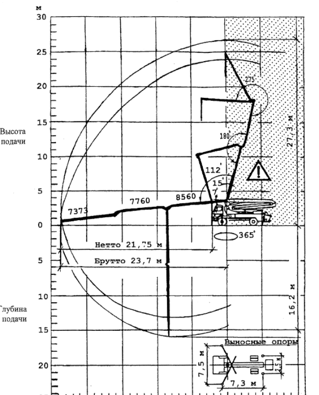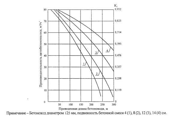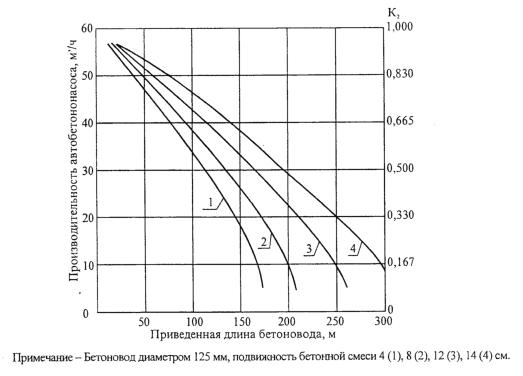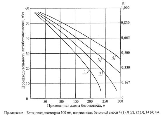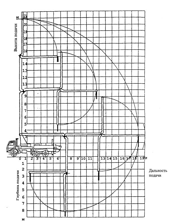 8.7. В начальный момент работы автобетононасоса температура пускового раствора и первых порций бетонной смеси в объеме, достаточном для заполнения бетоновода по всех его длине, должна быть в зависимости от температуры наружного воздуха не ниже 30-40 °С. 8.8 Непосредственно перед началом транспортирования бетонной смеси бетоновод должен быть прогрет горячей водой, паром или теплым воздухом, пропускаемым по трубопроводу. 8.9 Средняя температура бетонной смеси в процессе транспортирования по бетоноводу, включая периоды остановки автобетононасоса, не должна опускаться ниже величин, обеспечивающих необходимую температуру бетонной смеси, укладываемой в конструкцию. 8.10 Возможно транспортирование бетонной смеси с противоморозными добавками нитрата натрия NaNO2. Транспортирование бетонных смесей с добавками хлористых солей не допускается во избежание интенсивной коррозии деталей автобетононасоса и бетоноводов. Не допускается также применение поташа, который способствует быстрому загустеванию бетонной смеси. 8.11 При транспортировании бетонной смеси по неутепленному бетоноводу остановка автобетононасоса Допускается не более 15 мин. При более длительной остановке необходимо принять меры для удаления бетонной смеси из трубопровода. В случае утепленного бетоновода допускается остановка автобстононасоса на 20-30 мин. Состояние основания, на которое укладывается бетонная смесь, а также температура основания и способ укладки должны исключать возможность замерзания смеси в зоне контакта с основанием или с ранее уложенным бетоном. Продолжительность вибрирования бетонной смеси должна быть увеличена не менее чем на 25% по сравнению с летними условиями. 8.12 Очистку бункера автобетононасоса и бетоповода следует производить подогретой водой. После очистки оставшуюся воду необходимо полностью удалить. 9 РАЗРАБОТКА ПРОЕКТОВ ПРОИЗВОДСТВА РАБОТ9.1 Осуществление работ по укладке бетонной смеси в конструкцию с помощью автобетононасоса без проекта производства работ (ППР) запрещается. 9.2 Комплект машин по укладке бетонной смеси состоит из автобетононасоса для подачи и распределения бетонной смеси и необходимого по расчету количества автобетоносмесителей для транспортировки готовой бетонной смеси. 9.3 При необходимости перекачивания бетонной смеси на расстояния, превышающие дальность или высоту подачи одним автобетононасосом, комплект машин может включать два автобетононасоса, устанавливаемых последовательно. При этом необходимо соблюдать следующие требования: - первый автобетононасос должен устанавливаться для подачи бетонной смеси в приемный бункер второго автобетононасоса; - состав бетонной смеси должен приниматься в соответствии с требованиями, предъявленными для перекачки бетонной смеси автобетононасосом; - автобетононасосы должны работать с равной производительностью. 9.4 Для оценки высоты и дальности подачи бетонной смеси, а также для определения интервала стоянок автобетононасосов следует пользоваться графиками по рисункам 8 и 10. В графиках предусмотрен комплект инвентарных труб (20 шт.). Для определения интервала стоянок автобетононасоса на графике откладывают контурные точки разреза здания или сооружения. 9.5 Бетонную смесь необходимо доставлять в количестве, обеспечивающем укладку 40-250 м3 в смену. При этом общий 