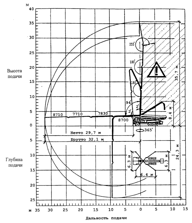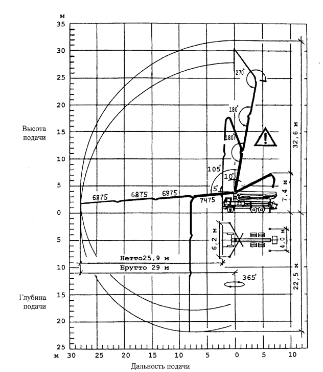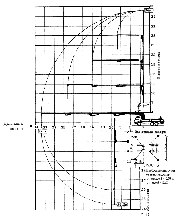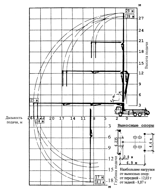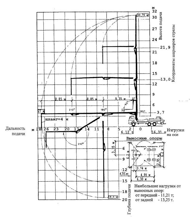 4.8. Для обеспечения нормальной работы распределительных стрел автобетононасосов необходимы следующие мероприятия: - установка автобетононасоса на подготовленную в соответствии с ППР площадку; - установка и фиксация выносных опор (аутригеров); - включение гидравлической системы и развертывание распределительной стрелы; - проверка работоспособности; - перемещение распределительной стрелы к месту бетонирования или к месту подключения стационарного бетоновода. 4.9. В случаях, когда вылет стрелы недостаточен для подачи и распределения бетонной смеси в конструкции, укладывают бетоноводы из бесшовных металлических труб. При этом прокладку бетоноводов рекомендуется осуществлять из инвентарных металлических труб в сочетании с бетоноводом стрелы автобетононасоса. Пределы подачи и распределения бетонной смеси в конструкции с помощью стрелы автобетононасоса приведены в таблицах 2, 3 и 4, а в сочетании с комплектом металлических труб - на рисунках 9, 10 и 11. Концевые участки бетоноводов должны выполняться только из резинотканевых распределительных шлангов, входящих в комплект автобетононасоса. В связи с большой массой труб, заполненных бетонной смесью, горизонтальный участок бетоновода должен монтироваться на прочных опорах (подкладки, козлы, подмости, леса, выдвижные трубчатые стойки и т.п.), исключающих провисание труб. Расстояние между опорами не должно превышать 2,5-3 м. На вертикальных участках бетоновода каждое звено трубопровода необходимо закреплять. Во избежание разрыва соединений запрещается закреплять или укладывать на какие-либо опоры верхнее и нижнее колена стояка бетоновода. Звенья трубопровода должны стыковаться на быстроразъемных инвентарных соединениях, обладающих прочностью и герметичностью, и при этом особое внимание должно уделяться устранению дефектов (трещин, отверстий и т.д.). Неплотности в соединении повышают опасность возникновения пробок.