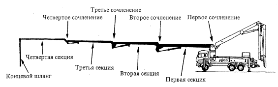 Примечание: 1.Горизонтальный участок бетоновода может быть смонтирован по любому радиусу в заштрихованной зоне. 2. Вертикальный стояк из стальных труб может быть смонтирован по любой точке отрезка А-Б (сечение 2-2) 3. Размещение автобетононасоса вблизи сооружения следует выполнять в соответствии с графиком. При расположении автобетононасоса вблизи сооружения следует выполнять в соответствии с графиком. При расположении автобетононасоса у сооружения ближе, чем предусмотрено графиком, следует устроить навес над рабочим местом машиниста. Рисунок 8 – Возможные зоны подачи и распределения бетонной смеси с одной стоянки бетононасоса фирмы «SCHWIHG» Рисунок 9 – Сочленения секций стрелы
