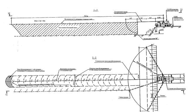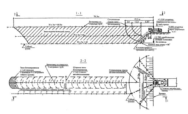 Примечания: 1. Бетоновод состоит из трубопровода на стреле автобетононасоса и присоединенных к ним на муфтах двадцати 3-метровых стальных труб 2. Бетонирование следует осуществлять методом «на себя» в последовательности, указанной на сечении 2-2. 3. Стоянки автобетононасосов уточняются в ППР с таким расчетом, чтобы охватить как можно большую зону подачи и распределения бетонной смеси при наименьшем количестве стоянок. 4. При необходимости в откосе котлована у мест стоянки автобетононасоса устраивают узкие траншеи шириной до 1 м для размещения стрелы автобетононасоса, как показано на сечении 1-1. 5. Установка автобетононасоса на краю откоса должна выполняться в соответствии с данными таблицы. 6. В таблице приведены значения ширины откоса при глубине заложения Н, в метрах. Расстояние от опоры машины до бровки откоса не должно быть меньше 1 м.