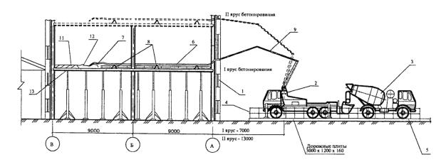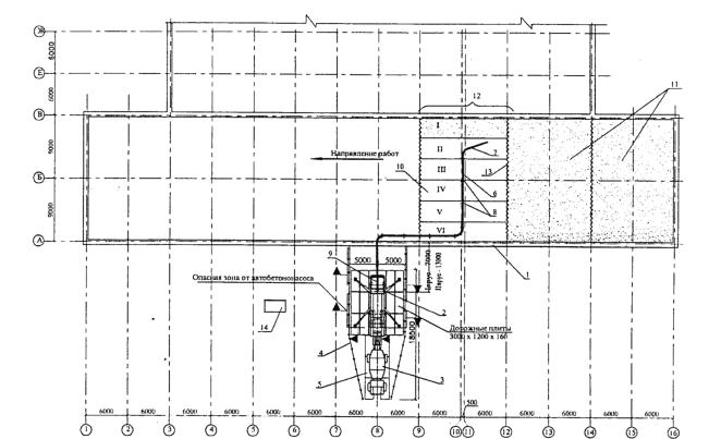 1 - строящееся здание; 2 - автобетононасос; 3 - автобетоносмеситель; 4 - временное ограждение; 5 - временная автодорога; 6 - стационарный бетоновод d=125 мм; 7 - распределительный рукав; 8 - опоры бетоновода; 9 - стрела бетононасоса; 10 - опалубка; 11 - забетонированные захватки; 12 - бетонируемая захватка; 13 - рабочий шов; 14 - емкость для слива загрязненной воды; I - VI -номера делянок Рисунок 12 - Укладка бетонной смеси в перекрытие 1 - строящееся здание; 2 - автобетононасос; 3 - автобетоносмеситель; 4 - временное ограждение; 5 - временная автодорога; 6 - стационарный бетоновод d=125 мм; 7 - распределительный рукав; 8 - опоры бетоновода; 9 - стрела бетононасоса; 10 - рабочий шов; 11 - забетонированная захватка; 12 - бетонируемая захватка Рисунок 13 - Привязка автобетононасоса 5 ТРАНСПОРТИРОВАНИЕ БЕТОННЫХ СМЕСЕЙ5.1. Бетонные смеси с предприятия-изготовителя транспортируют только в автобетоносмесителях с последующей перегрузкой в автобетононасосы. 5.2. Максимальное время транспортирования готовых бетонных смесей автобетоносмесителями должно быть не более 2 ч. 5.3. Фактическое расстояние от завода-изготовителя до объекта устанавливается контрольным хронометражем с оформлением акта. 5.4. В зависимости от вида смеси, загруженной в автобетоносмеситель перед транспортировкой, работа автобетоносмесителя возможно в трех режимах: - периодическое включение и выключение барабана во время транспортирования смеси до объекта, но при обязательном перемешивании в течение 10 мин. перед разгрузкой (для готовой смеси); - включение барабана непосредственно после его наполнения (для жестких смесей); - включение барабана в пути следования или при подъезде к строительному объекту за 10-20 мин. до разгрузки (для сухих смесей). 5.5. Барабаны автобетоносмесителей необходимо промывать водой после каждой перевозки бетонной смеси и после каждой рабочей смены. С этой целью в разрабатываемом ППР должно быть предусмотрено водоразборное устройство с гибким шлангом и место установки емкости для слива отходов. Объем сливаемых отходов зависит от типа автобетоносмесителя и составляет 200-350 л. 5.6 Полный цикл работы автобетоносмесителя состоит из следующих операций: - загрузки смесителя готовой бетонной или сухой смесью и заправки бака для воды; - транспортирование; - подачи в смеситель необходимой порции воды при загрузке барабана сухой смесью и перемешивания или побуждения готовой бетонной смеси при транспортировании на дальние расстояния; - разгрузки бетонной смеси; - промывки смесителя и лотков. 5.7. Побуждение или перемешивание бетонной смеси в пути следования разрешается на прямых участках дороги с твердым покрытием. Большинство автобетоносмесителей имеют привод смесительного барабана от двигателя автомобиля, что не позволяет осуществлять перемешивание при движении в холмистой местности и горах. Однако, существуют автобетоносмесители (например, СБ-92В-2, СБ-172-1 с приводом смесительного барабана от автономного двигателя), рекомендуемые для эксплуатации в таких условиях. 5.8. Для исключения расслоения и снижения подвижности бетонной смеси во время транспортирования к объекту рекомендуется периодическое включение барабана автобетоносмесителя. Перед разгрузкой на стройплощадке необходимо перемешать бетонную смесь в барабане автобетоносмесителя при 10-12 об/мин, в течение 3 мин. 5.9. Подвижность готово