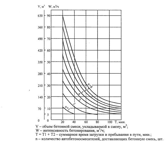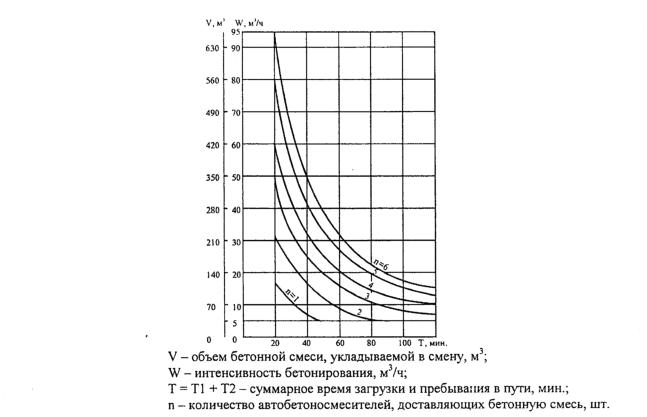 Рисунок 20 – График определения необходимого качества автобетоносмесителей емкостью 4,3 м3 фирмы White Western Star при доставке бетонной смеси для автобетононасосов 9.11. При назначении состава бригады для работы с комплектом машин необходимо руководствоваться следующими рекомендациями: - работу по управлению бетононасосом осуществляет машинист, имеющий разряд не менее 5-го; - контроль за составом бетонной смеси, загружаемой в бункер автобетононасоса, осуществляет один из бетонщиков. Для монтажа и демонтажа стационарных бетоноводов из инвентарных труб следует назначать звено в составе не менее 4 слесарей-монтажников. Для распределения бетонной смеси в массиве конструкции с помощью стрелы автобетононасоса состав звена должен включать двух бетонщиков 4-5 разрядов. При распределении бетонной смеси с использованием стационарного бетоновода из инвентарных труб в тонкостенные конструкции, а также конструкции, требующие дополнительной обработки поверхности, звено должно состоять из 3-4 бетонщиков 3-5 разрядов. При бетонировании густоармированных конструкций сложной конфигурации целесообразно в состав бригады включать плотника (или монтажника) для наблюдения за состоянием опалубки в процессе бетонирования и принятия срочных мер по ее ремонту в случае необходимости. 9.12 Подвижность бетонной смеси выбирается с учетом дальности подачи ее по бетоноводам и продолжительности транспортировки от бетонного завода до объекта. При транспортировании бетонной смеси следует руководствоваться п.п. 3.1, 5.2, 5.3.