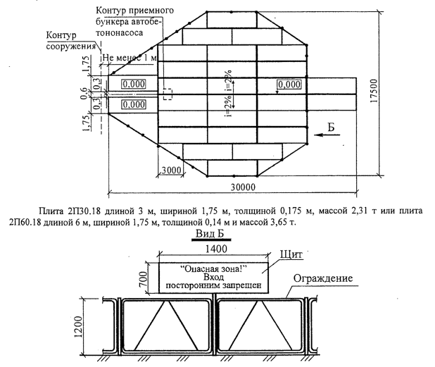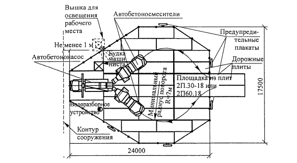Рисунок 22 – Схема размещения комплекта машин при производстве бетонных работ на объекте Рисунок 23 – Схема раскладки дорожных плит и установки ограждения Площадка для установки автобетононасоса и автобетоносмесителей выкладывается дорожными плитами согласно рисунку 23 и ограждается инвентарным ограждением высотой не менее 1,2 м. Пример ограждения площадке приведен на схеме. Количество предупредительных плакатов и их расположение должно соответствовать проекту производства работ, однако их должно быть не менее 6 штук. Освещенность стоянки машин решается в проекте производства работ. При этом общая освещенность площадки должна составлять не менее 2 лк, а освещенность рабочего места машиниста и в зоне приемной воронки автобетононасоса - не менее 25 лк. На рисунке 22 приведены ориентировочные места установки светильников, учитывающие расположение пульта управления автобетононасоса и зоны работы рабочего, принимающего бетон в воронку автобетононасоса. Инвентарная будка предназначена для обогрева моториста и рабочего, принимающего бетон, в случае ненастной погоды. В этом случае управление автобетононасосом при наличии надежной связи с местом укладки бетонной смеси осуществляется дистанционно с помощью выносного пульта. Водоснабжение площадки, необходимое для промывки автобетононасоса, бетоноводов, автобетоносмесителей, решается в ППР, однако расположение водоразборных устройств от площадки не должно превышать 15 м при длине шланга 20 м. Места установки емкостей для слива отходов после промывки автобетононасосов, автобетоносмесителей, бетоноводов определяется в ППР. Необходимые материалы для устройства площадки приведены в таблице 9. Таблица 9 Ведомость потребности материалов для устройства одной площадки