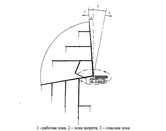 Рисунок 24 – Рабочие зоны распределительной стрелы (4 секции) бетононасоса Величина угла α для отечественных и зарубежных автобетононасосов